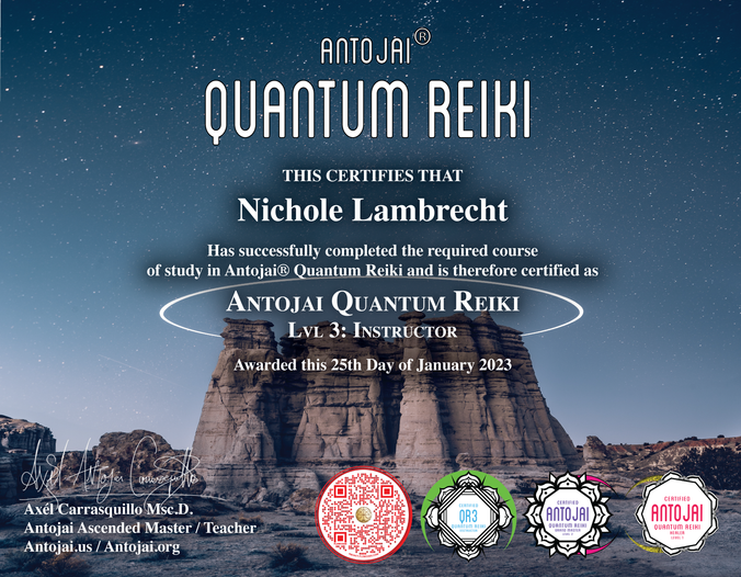 Nichole is honored to have studied and trained directly with Dr. Axel Carasquillo, the founder and developer of multiple forms of energetic medicine. Ascended Master Antojai is a world-renowned Shaman and Guru.